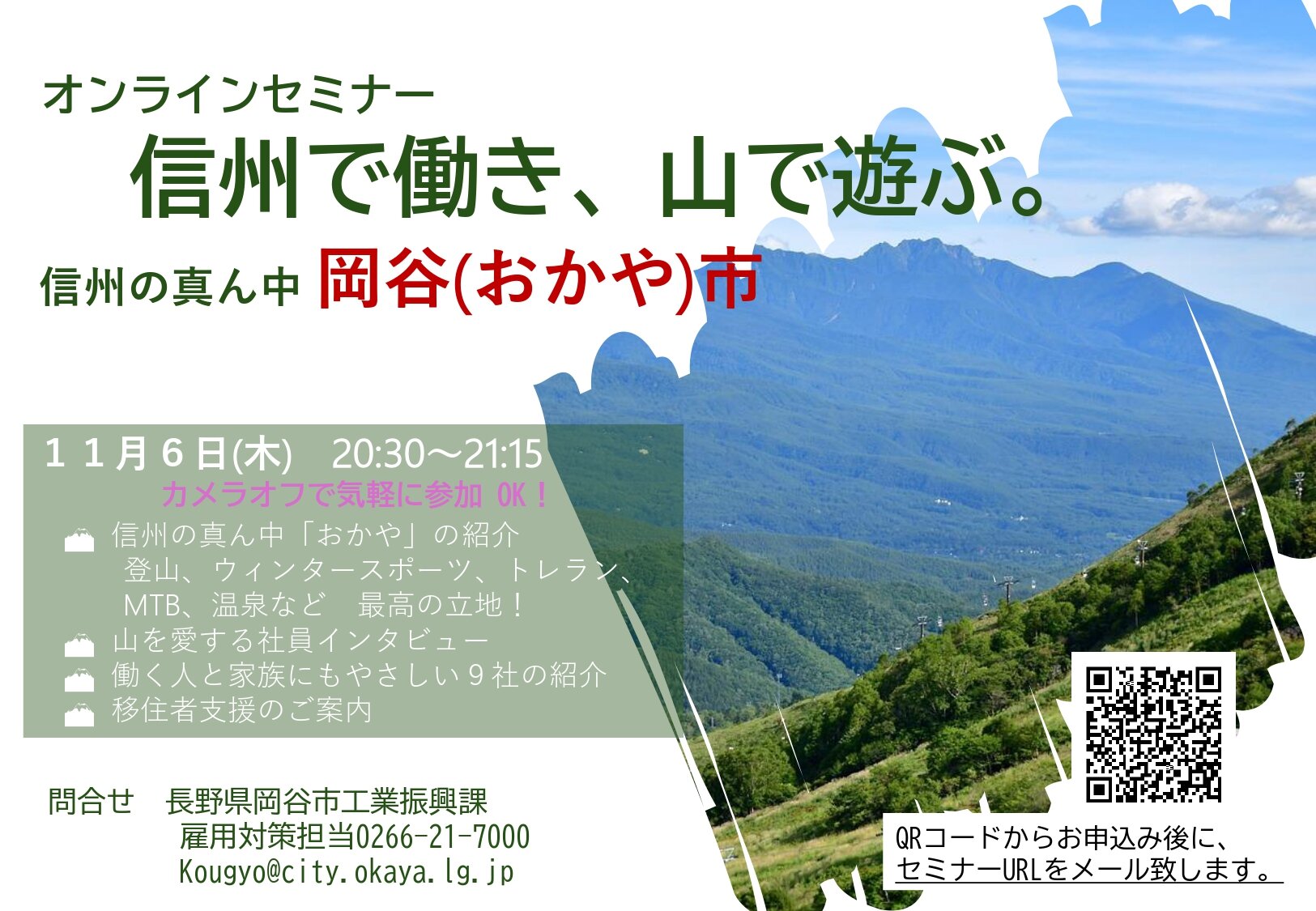 長野県岡谷市主催 2025年11月6日(木)20:30~開催の「信州で働き、山で遊ぶ」オンラインセミナーに